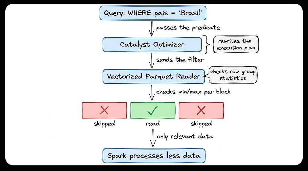 Essa otimização existe em várias tecnologias. SQL Server, BigQuery e DuckDB são alguns exemplos, cada uma com sua implementação. O que muda é o componente responsável. No Spark, esse papel é do Catalyst, um otimizador embutido que analisa o plano de execução e identifica quais filtros podem ser antecipados. Quando você roda uma query com filtro em cima de uma tabela Delta, o Catalyst repassa o predicado direto para o leitor do Parquet, que usa as estatísticas internas dos arquivos para pular blocos inteiros que não atendem à condição, sem nem abri-los.