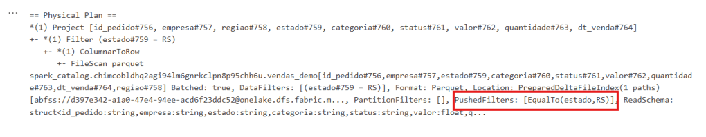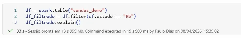 Vimos o conceito, entendemos o papel do Catalyst e do Vectorized Parquet Reader, e confirmamos com o explain() que o pushdown estava acontecendo de verdade numa tabela Delta no Microsoft Fabric.